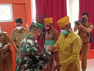Selanjutnya, Pjs.Bupati Lampung Timur Fredy, langsung menyerahkan cindra  mata dan tali asih bagi Veteran dan Pepabri diruang vicon kantor gugus tugas Covid-19. (Prayitno)